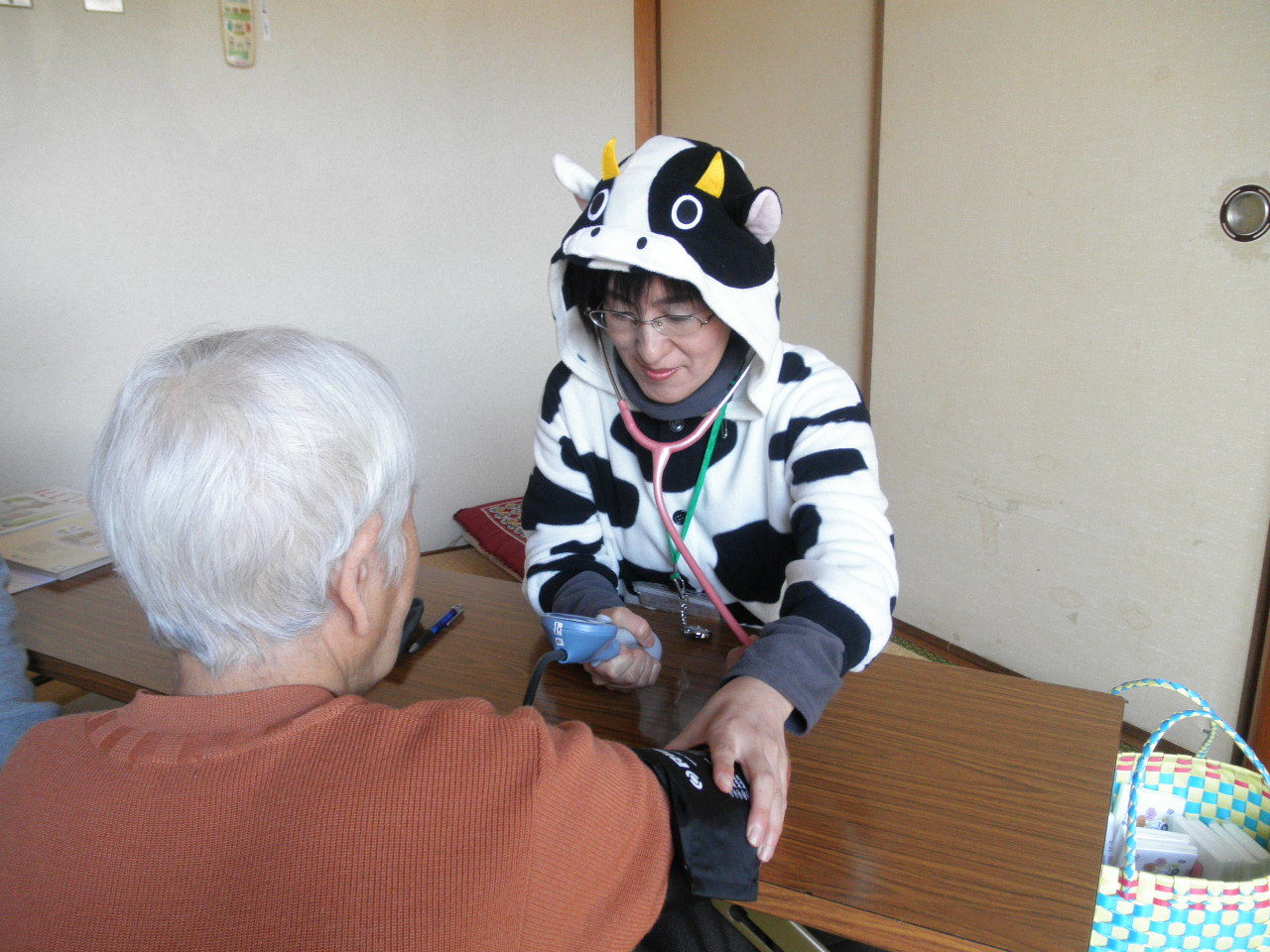 なぜかキュートなうしさんが血圧を測っています