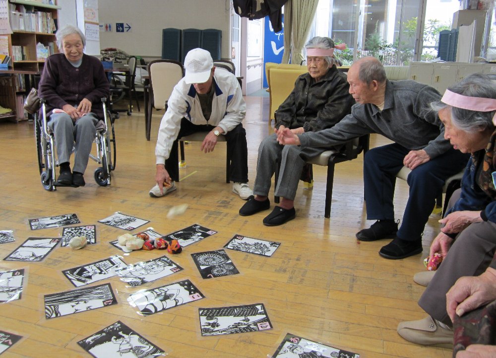 絵や文字を見つけてそのかるたの上におじゃみを投げて赤・白チーム対抗戦!!