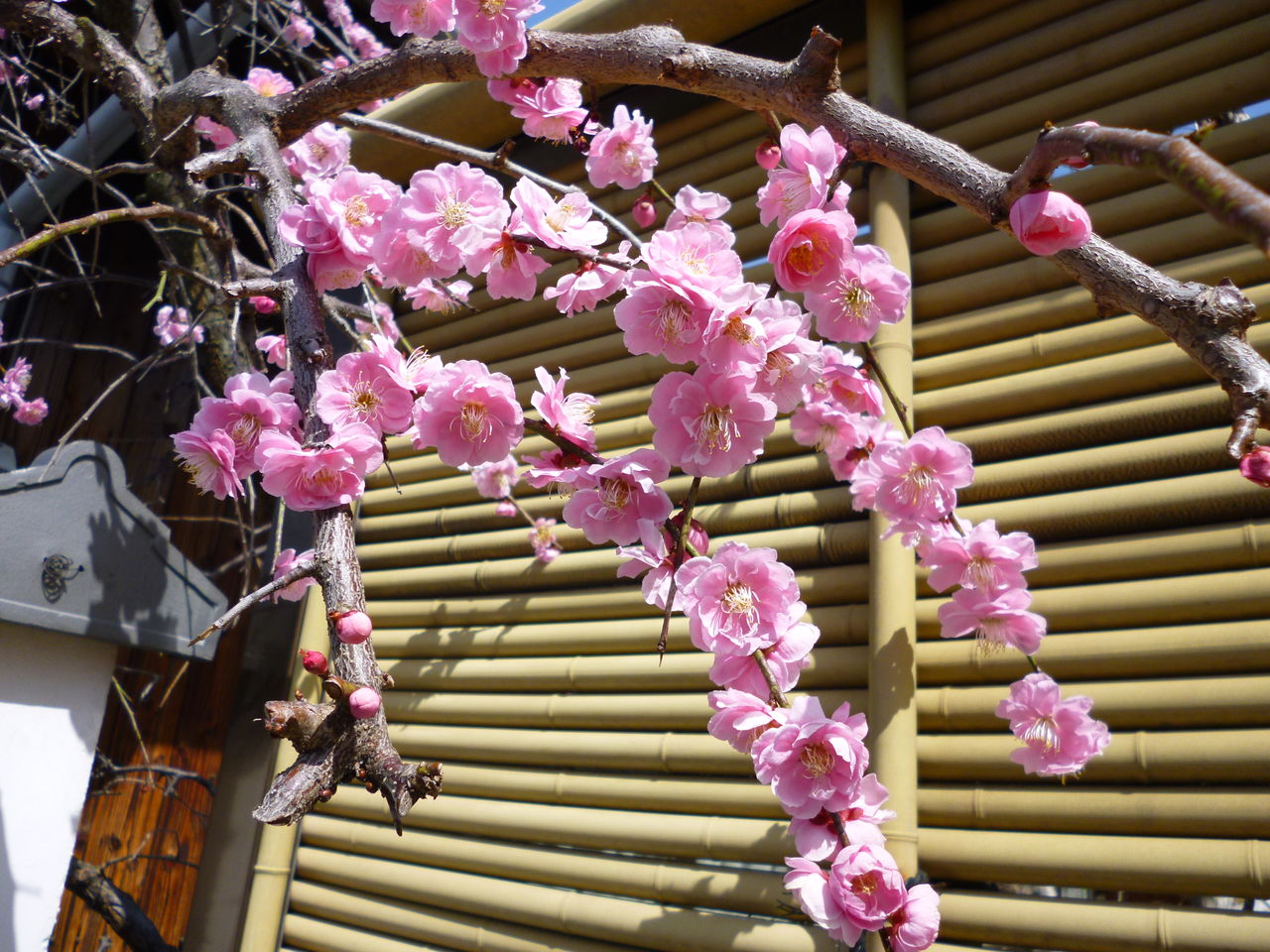 その玄関先に しだれ梅の枝が お隣の白壁からのぞいています。