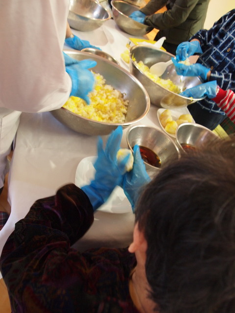 杵をつかないご利用者の方にはついた餅を丸めたり、ムスビを握ってもらう作業を手伝っていただきました。