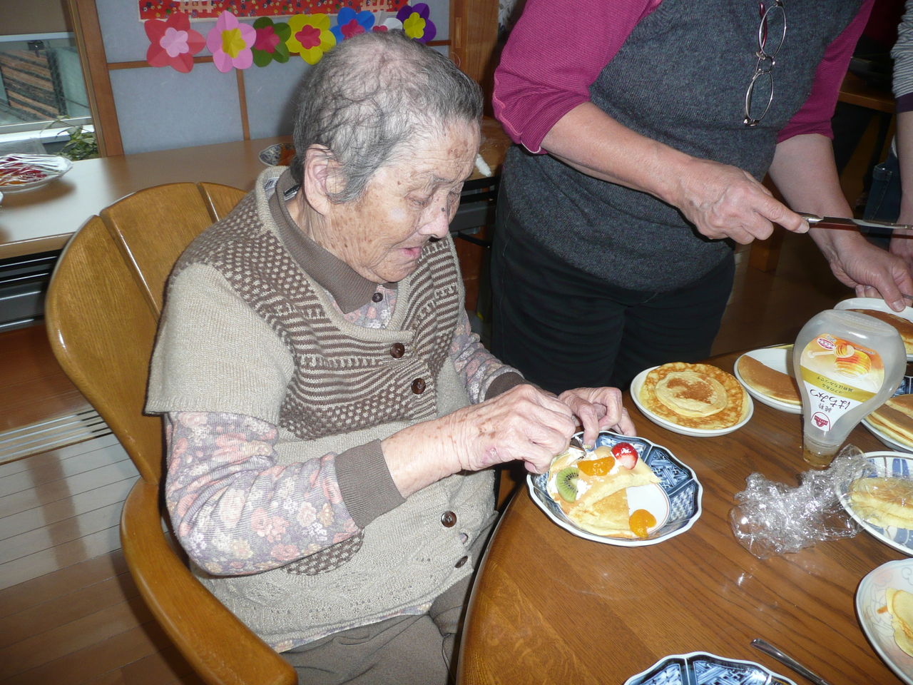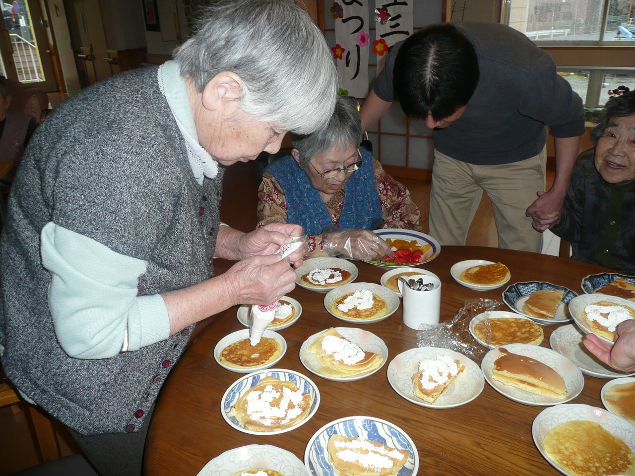 さて、ひな祭り会ではひな祭りのお祝いをして、ホットケーキ作りを楽しまれました