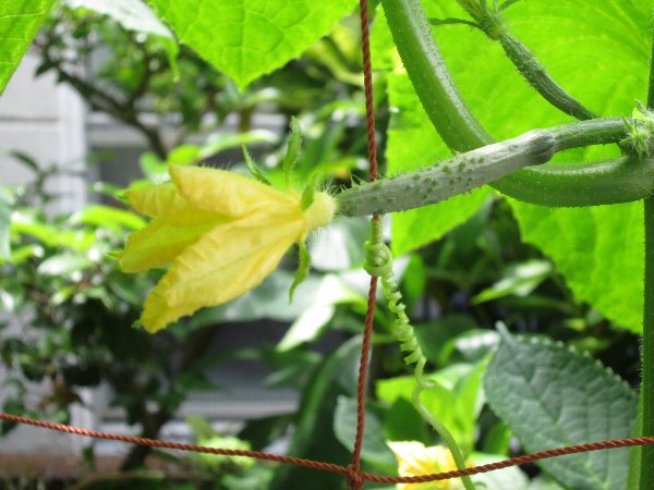 杭で支え、ネットを張ると蔓が伸びて、可愛い花が咲き始めました