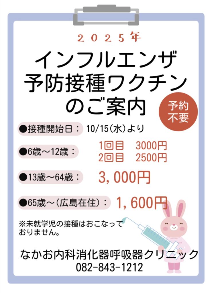 10月15日(水)からインフルエンザワクチン接種を開始いたします。(予約は不要です。)